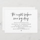 Na noite anterior ao nosso grande dia, o moderno design minimalista temático, o cartão de convite para janto de ensaio de casamento (em caracteres pretos e você pode facilmente mudar a cor da fonte). Planejar uma celebração do Janto de ensaio do casamento com a futura noiva e futura noiva, antes do seu grande dia? Convide os convidados com este Cartão de Convite para Janto de Ensaio de Casamento perfeito. Adicione os detalhes do janto de ensaio em letra/letra correspondente.