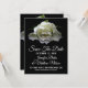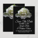 Lindo anúncio de Save the Date de casamento com uma fotografia de uma rosa branca coberta de orvalho em flor, em um fundo preto. Personalize o texto de acordo com as suas necessidades. Ótima maneira de notificar todos com antecedência, do seu casamento de destino.