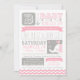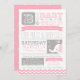 Um belo convite para um chá de fraldas para uma menina. Pequeno elefante e pássaro bonitos, com listras de diafrão, tema de poster de circo e tipografia fofa!