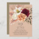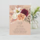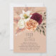 Comemore ao estilo com este convite apenas para a recepção de pêssego fuzz, apresentando florais pintados à mão em burgundy, pêssego, marfim, e blush com sotaques de palma e pampas secos. Montada em um fundo macio de beige, esta design romântica é perfeita para casais que hospedam uma recepção após cerimônia, uma festa de jardim ou uma celebração noturna. Uma tendência e uma escolha elegante alinhadas com a cor "Peach Fuzz" do ano de 2025.