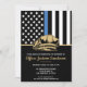 Este design apresenta uma bandeira de uma força policial com listras pretas e brancas, e uma faixa de linha azul fina também. O distintivo da polícia e o texto em dourado ficam acima de todos os detalhes da festa para a aposentadoria do oficial de aplicação da lei, xerife, capitão ou chefe de polícia.