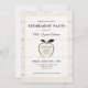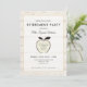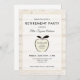 Este convite de festas de aposentadoria é design para um professor. O fundo é uma madeira rústica e o design é acentuado com um desenho de uma maçã.