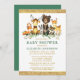 Watercolor Woodland Animal Chá de fraldas Invitation. Os bebês incluem Urso, Veado, Moose, Raccoon, Coelho Coelho, Raposa e Coruja em folhas de eucalipto e verde florestal. Texto Dourado, Brilho Dourado, Fundo Verde.