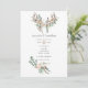 Convite de casamento rústico marrom empoeirado com bolas de seda de algodão e folhas de eucalipto com penas e chifres boho.