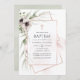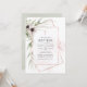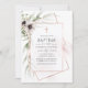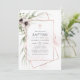 Convite batismo com flores anêmonas e folhas de eucalipto em moldes geométricos de ouro rosa.
