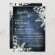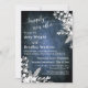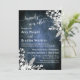Aqui está um convite encantador para o seu evento exclusivo após a recepção de casamento. O fundo foi inicialmente coberto com um gráfico azul escuro, texturizado e terroso, que apresenta textura de madeira e linhas vintage. Os cantos foram acentuados com respingos de aquarela floral em branco e preto/tons de cinza. Seus detalhes aparecem em branco brilhante. Para complementar a fonte sem serifa usada para o seu texto editável, adicionei as palavras-chave "felizes para sempre" mais os acentos "e" e "amor" no verso, usando uma fonte de caligrafia moderna e bonita.