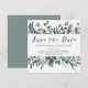 Este cartão moderno de salvar a data do casamento botânico apresenta folhas de aquarela em tons de verde, azul e cinza para um visual elegante que é ao mesmo tempo minimalista e rústico.