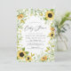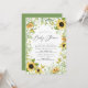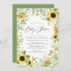 Convites elegantes para bebês de girassol com detalhes sobre o seu chá cercados por uma borda de girassol de cor d'água e folhagem verde-escura. O chá de fraldas de girassol convida à marcha atrás para um fundo verde sólido.