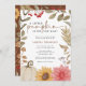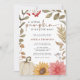 Uma abóbora moderna e elegante cai no chá de fraldas convite com abóbora, flores rosa e amarelas, cogumelos e folhas de outono.
