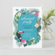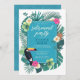 Convite colorido de festa de aposentadoria com uma moldura azul-turquesa e uma borda com um tucano ousado sentado entre flores de hibisco e folhas de palmeira em aquarela. O verso tem um padrão repetido de folhas de palmeira em tons de azul-turquesa. Adicione os detalhes do seu evento usando o modelo fornecido. Estes são perfeitos para eventos de verão, tropicais e/ou de destino. Procure ID577 para ver produtos correspondentes.