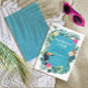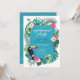 Convite de festa de engajamento colorido com uma moldura em tom de azul-verde e uma borda com um tucano ousado sentado entre flores de hibisco e folhas de palmeira em aquarela. O verso tem um padrão repetido de folhas de palmeira em tons de azul-verde. Adicione os detalhes do seu evento usando o modelo fornecido. Estes são perfeitos para eventos de verão, tropicais e/ou de destino. Procure ID577 para ver produtos correspondentes.
