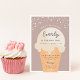 Anuncie sua pequena comemoração de aniversário de verão com estes convites temáticos de sorvete festivo em uma paleta de cores pastel macio. O design moderno apresenta um cone de waffle com uma colher de sorvete de baunilha com "aqui está a colher" arqueada no topo, e os detalhes da festa de aniversário do seu filho sob um fundo cor-de-rosa.