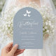 O nosso aqui é para a vida das borboletas Chá de panela tem um mínimo de design com um bonito fundo azul empoeirado e uma caligrafia branca complementada por borboletas em um estilo simples e limpo, com a frase "Aqui está para uma vida de borboletas" para honrar a futura noiva e desejar-lhe o melhor. Esta design vem no convite em forma de arco de tendências. Vá para a seção Personalizar modelo para adicionar suas informações. Escolha entre impressões ou um convite digital ecológico. Design original por Ana Garza/Kardz Studio Designs. Se tiver alguma pergunta, por favor contacte-me através do bate-papo Zazzle.