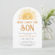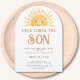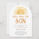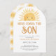 Convide a família e os amigos para o seu chá de fraldas temático com este belo convite para o chá de fraldas dos rapazes. Ele apresenta o texto "Aqui Vem O Filho" na tipografia da na moda, um lindo sol amarelo-aquarela, e uma forma popular de arco. O dorso é decorado com um padrão de sol sorridente. Facilmente personalizável. Original Watercolor © Michele Davies.