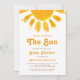 Este convite para chás de fraldas neutro em termos de gênero é decorado com uma aquarela solar e "Aqui Vem O Sol" na tipografia na moda. Facilmente personalizável. Use a Ferramenta Design para alterar o tamanho, o estilo ou a cor do texto. À medida que criamos a nossa trabalho de arte, não encontraremos esta imagem exata de outros designers. Original Watercolor © Michele Davies.