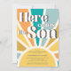 Este alegre convite para chá de fraldas de um rapaz temático do sol mostra "Aqui Vem O Filho" em retrô tipografia sobre um fundo colorido de explosão solar. Facilmente personalizável.