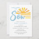 Você está planejando uma chá de fraldas para um garoto? Este belo convite para o chá de fraldas com tema solar apresenta o texto "Aqui Vem O Filho" na tipografia azul na moda com uma aquarela nascente em tons de amarelo. Facilmente personalizável. Original Watercolor © Michele Davies.