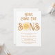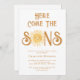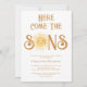Convide a família e amigos para o chá de fraldas dos seus gêmeos com o tema do sol com este belo convite à luz do sol. Apresenta o texto "Aqui Vem os Filhos" na tipografia da na moda com uma cor amarela e fofinha, sorrindo sol. Facilmente personalizável. Original Watercolor © Michele Davies.