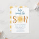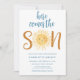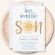 Este belo convite à luz do sol convida a família e os amigos para o chá de fraldas dos seus rapazes temerários. Ele apresenta o texto "Aqui Vem o Filho" na tipografia de na moda com um sorriso amarelo bonito e amarelo de aquarela. As costas estão decoradas com um padrão solar. Facilmente personalizável. Original Watercolor © Michele Davies.