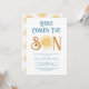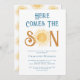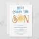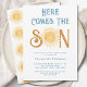 Convide a família e os amigos para o seu chá de fraldas temático com este belo convite para o chá de fraldas dos rapazes. Apresenta o texto "Aqui Vem o Filho" em tipografia retrô azul com uma aquarela amarela. As costas estão decoradas com um padrão solar. Facilmente personalizável. Original Watercolor © Michele Davies.