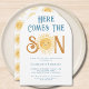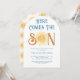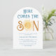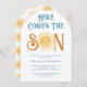 Convide a família e os amigos para o seu chá de fraldas temático com este convite para chás de fraldas de rapazes em forma de arco. Apresenta o texto "Aqui Vem o Filho" em tipografia azul na moda com um lindo sol de aquarela amarela. O dorso é decorado com um padrão de sol sorridente. Facilmente personalizável. Original Watercolor © Michele Davies.