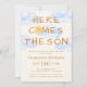 Convide a família e os amigos para o seu chá de fraldas temático com este belo convite para o chá de fraldas dos rapazes. Ele apresenta o texto "Aqui Vem O Filho" e um sol sorridente de aquarela amarela cercado por nuvens azuis sobre fundo de creme macio. As costas estão decoradas com um padrão solar. Facilmente personalizável. Original Watercolor © Michele Davies.