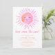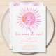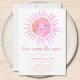 Convide a família e os amigos para o chá de fraldas da sua garota com tema-sol com este belo convite para chás de fraldas. Ele apresenta o texto "Aqui Vem O Sol" em tipografia rosa-na moda com uma aquarela solar. O dorso é decorado com um padrão de sol sorridente. Facilmente personalizável. Original Watercolor © Michele Davies.