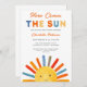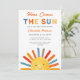 Convide a família e os amigos para o seu chá de fraldas temático com este convite para chás de fraldas ensolarados. Ele apresenta o texto "Aqui Vem O Sol" em tipografia colorida e um sol de aquarela. As costas estão decoradas com um padrão solar. Facilmente personalizável. Original Watercolor © Michele Davies.