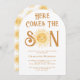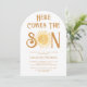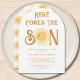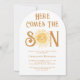 Convide a família e os amigos para o seu chá de fraldas temático com este belo convite à arca de chá de fraldas dos rapazes. Apresenta o texto "Aqui Vem o Filho" na tipografia da na moda com um lindo sol sorridente de aquarela amarela. As costas estão decoradas com um padrão solar. Facilmente personalizável. Original Watercolor © Michele Davies.