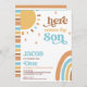 Blue Brown Retro Here Vem O estilo Sun Invitation Retro aqui vem o convite de aniversário ao sol com um título de fonte no estilo retrô, sol e arco-íris. O convite de primeiro aniversario deste rapaz é ideal para alguém que procura um primeiro convite de aniversário ao estilo retro para um bebê.