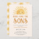 Convide a família e os amigos para o chá de fraldas do seu gêmeo com o tema do sol com este belo convite para chás de fraldas. Ele apresenta o texto "Here Come The Sons" na tipografia da na moda com um sol de aquarela amarelo giro em um fundo de creme macio. O dorso é decorado com um padrão de sol sorridente. Facilmente personalizável. Original Watercolor © Michele Davies.