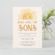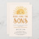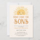 Convide a família e os amigos para o chá de fraldas do seu gêmeo com o tema do sol com este belo convite para chás de fraldas. Ele apresenta o texto "Here Come The Sons" na tipografia da na moda com um sol de aquarela amarelo giro em um fundo de creme macio. Facilmente personalizável. Original Watercolor © Michele Davies.