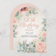 convite de aniversário bonito cor-de-água, cor-de-rosa, floral e verde, em forma de 90 com brilho dourado. Texto é uma fonte elegante de script. Entre em contato comigo para obter assistência com a personalização ou para solicitar a correspondência ou a coordenação de produtos Zazzle para o seu partido.