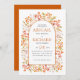 Este convite de casamento no outono mostra uma fronteira de bagas de laranja queimadas e folhas formando um arco. O lado frontal deste charmoso design exibe um esquema de cor laranja queimado junto com os nomes e o texto, todos elegantemente enquadrados dentro do arco de bagas e folhas. A parte de trás do convite é uma cor laranja sólida queimada, fornecendo um aspecto coeso.