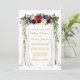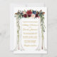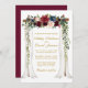 Cartão de Convite Floral para Casamento Elegante Canopy Watercolor Burgundy Marsala inclui belos rosas burgundy, rosas rosa, flores vermelhas e flores azuis. O arco da copa do casamento da madeira inclui vegetação botânica. Dourado Script.
