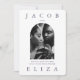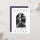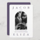 O convite para casamento de fotos roxas com tom de médio elegante apresenta um layout moderno com tipografia ousada e um roxo chic atrás do convite editável para sua cor personalizada! O verso inclui uma segunda foto, e seu código rsvp qr para que os convidados possam responder no seu site de casamento.