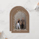 Este elegante arco em forma de salva de data apresenta um sofisticado fundo marrom do terracota com delicados desenhos de linha botânica que enquadram a área central de fotos. "Save the Date" (Salvar a data) aparece em um script gracioso no topo, enquanto os nomes dos casais são exibidos de forma destacada na parte inferior da tipografia do na moda. O design global combina elementos boho-chic modernos com romance eterno, usando tons de terra quente e motivos naturais para criar um anúncio contemporâneo, porém clássico, perfeito para casais planejando uma celebração ao ar livre ou casamento outono.