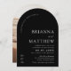 Um design de convite para casamento elegante e na moda com um layout moderno em um tema elegante minimalista preto e branco. O convite mostra linhas limpas e um layout de tipografia sofisticado, usando fontes ousadas sans-serif emparelhadas com sotaques sutis de script. A arca serve como a peça central, com detalhes chave do casamento, como os nomes do casal e a data do evento exibidos de forma destacada. O design enfatiza a simplicidade e o refinamento, usando alto contraste e espaço negativo para criar um eterno e aparência contemporânea. Perfeito para casais que buscam uma estética moderna e química para seu dia especial.