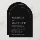 Um design de convite para casamento elegante e na moda com um layout moderno em um tema elegante minimalista preto e branco. O convite mostra linhas limpas e um layout de tipografia sofisticado, usando fontes ousadas sans-serif emparelhadas com sotaques sutis de script. A arca serve como a peça central, com detalhes chave do casamento, como os nomes do casal e a data do evento exibidos de forma destacada. O design enfatiza a simplicidade e o refinamento, usando alto contraste e espaço negativo para criar um eterno e aparência contemporânea. Perfeito para casais que buscam uma estética moderna e química para seu dia especial.