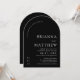 Um design de convite para casamento elegante e na moda com um layout moderno em um tema elegante minimalista preto e branco. O convite mostra linhas limpas e um layout de tipografia sofisticado, usando fontes ousadas sans-serif emparelhadas com sotaques sutis de script. A arca serve como a peça central, com detalhes chave do casamento, como os nomes do casal e a data do evento exibidos de forma destacada. O design enfatiza a simplicidade e o refinamento, usando alto contraste e espaço negativo para criar um eterno e aparência contemporânea. Perfeito para casais que buscam uma estética moderna e química para seu dia especial.