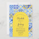 Este design rústico apresenta um padrão de fundo de azulejos portugueses, azulejos, de cor aquática azul, amarela e branca. Personalize-o com os nomes da noiva e do noivo em um roteiro de caligrafia azul e o texto remanescente em uma combinação de sans serif, copperplate e itálico em forma de arco amarelo. Um padrão de azulejo correspondente aparece no lado oposto.