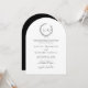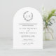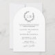Convite de casamento elegante e clássico com arco de código QR preto e branco com coroa de folhas e monograma.