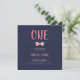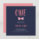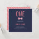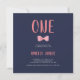 Um primeiro convite de aniversário moderno para sua garotinha em marinho, cor-de-coral rosa, com arco de aquarela, letra escrita com pincel e padrão de stripe diagonal no reverso.