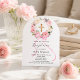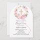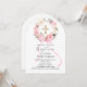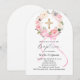 Um convite clássico em forma de arco. Um fundo branco elegante, decorado com flores rosa e brancas pintadas à aguarela em uma grinalda, um laço rosa e uma cruz dourada. Personalize e adicione um nome e detalhes.