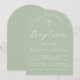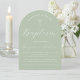 Um convite de batismo simples, moderno, em forma de arco e neutro em termos de gênero. Tem apenas texto branco sobre fundo verde oliva. Na parte superior há uma cruz branca com texto arqueado acima dela. A ocasião e o nome são escritos em grafia cursiva.