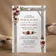 Convites de casamento outono com um fundo branco chique e sofisticado que pode ser alterado para qualquer cor, uma exibição de flores em aquarela em estilo burgundy, vermelho marsala e blush em um arco de madeira rústico, um coração esculpido com as iniciais do casal e um modelo de convite de casamento moderno.