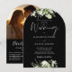 Este convite de casamento floral preto e branco elegante com folhagem pode ser personalizado com suas informações em tipografia sofisticada com sua foto especial, detalhes do site de casamento e seu código QR no verso. Projetado por Thisisnotme©