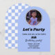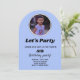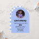 Convite Arco de Foto Personalizado. Este convite personalizado apresenta um design simples de arco de foto com texto personalizado. Este design pode ser totalmente personalizado para atender às suas preferências. Este convite pode ser usado para festa de aniversário de crianças e adultos. Tem um belo fundo azul com padrão cruzado no verso.