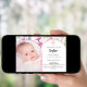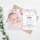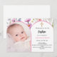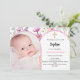 Adicione sua própria foto de tamanho vertical. Uma moldura de foto em forma de arco cor-de-rosa. Decorada com flores cor-de-rosa e uma cruz dourada. Personalize e adicione um nome e detalhes.