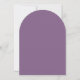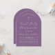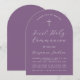 Um convite de primeira comunhão simples e moderno, com formato de arco e neutro. Possui apenas texto branco sobre um fundo rosa empoeirado. Na parte superior, há uma cruz branca com texto arqueado acima dela. A ocasião e o nome são escritos à mão.